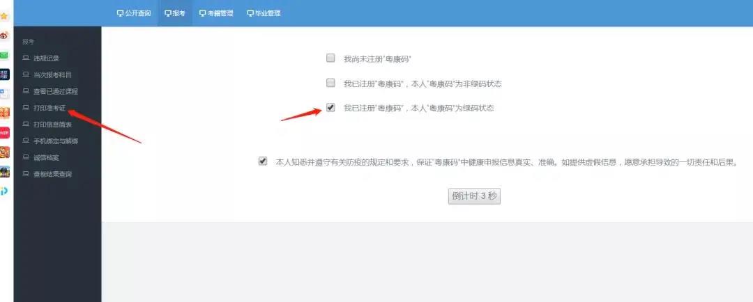3、先點擊上方導航欄的【報考】,再點擊左側導航欄的【打印準考證】按鈕,右側會顯示出考生本次考試的基本信息。