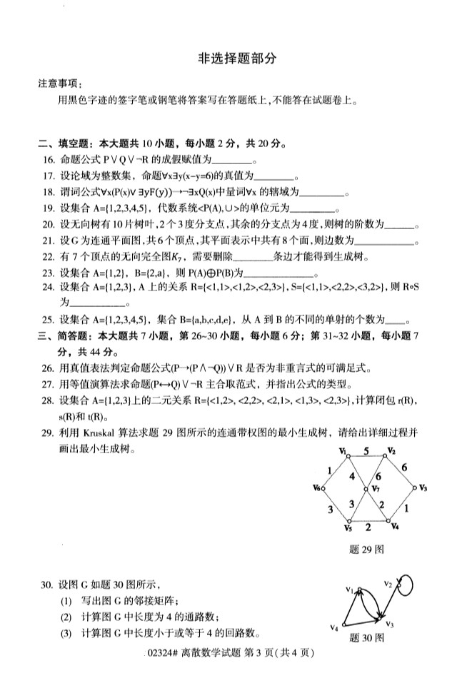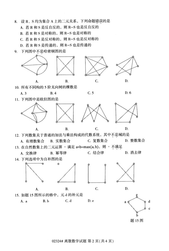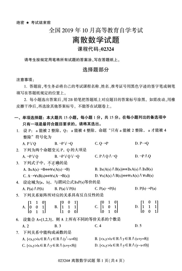 全國2019年10月自考02324離散數學試題
