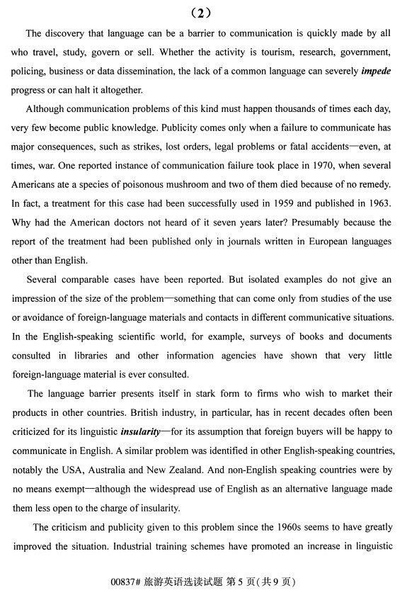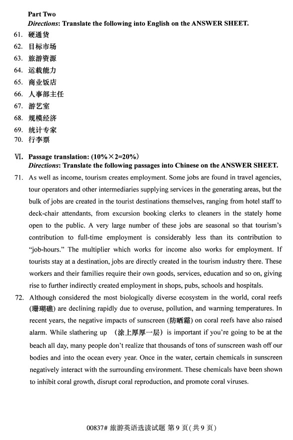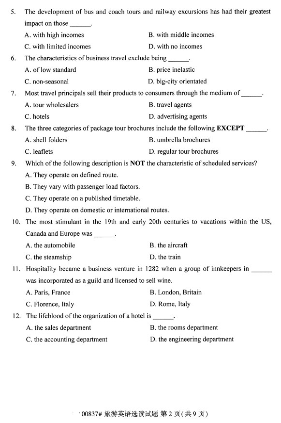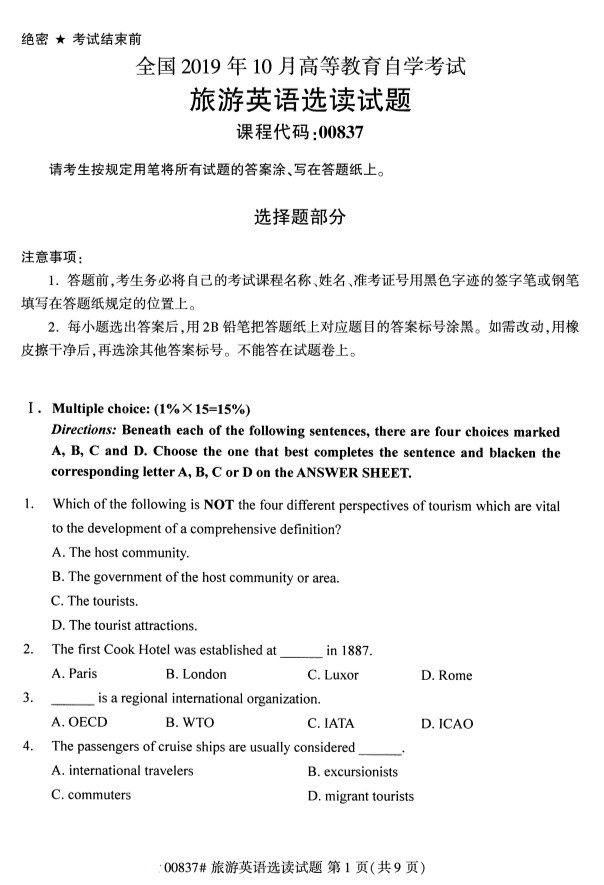 所在位置:廣東省自考網 > 試題題庫 > 自考試卷 > 全國2019年10月自考00837旅游英語選讀試題