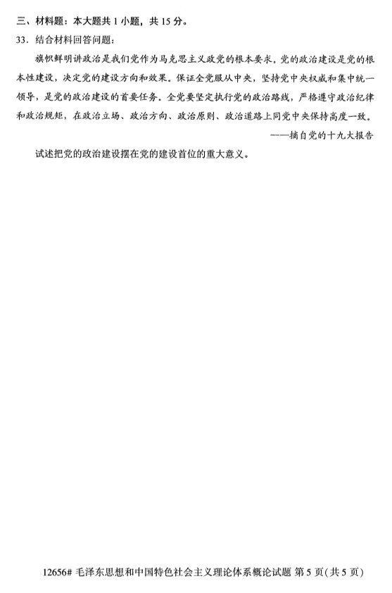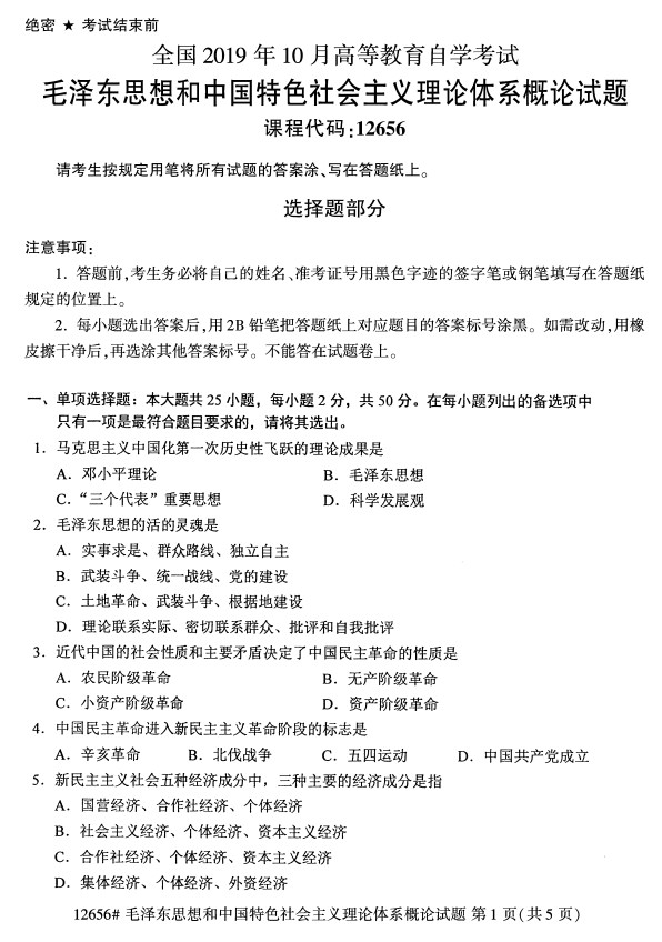 全國2019年10月自考12656毛澤東思想和中國特色社會主義理論體系概論試題