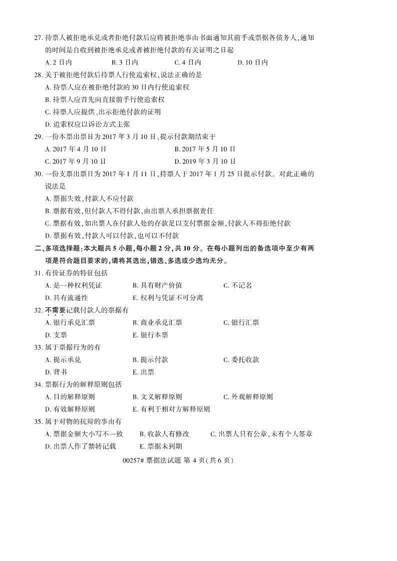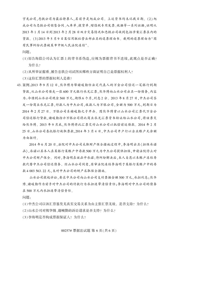全國2019年10月自考00257票據法試題
