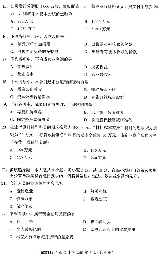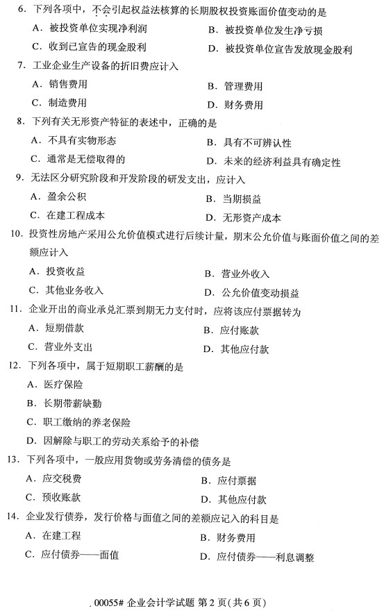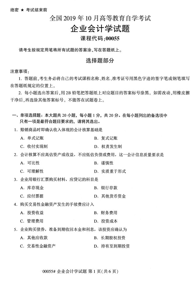 全國2019年10月自考00055企業(yè)會(huì)計(jì)學(xué)試題
